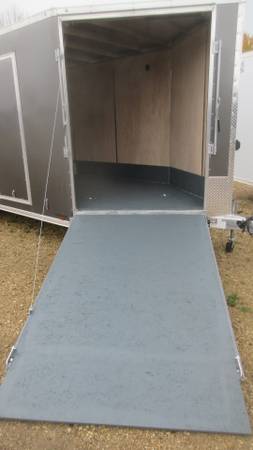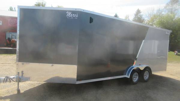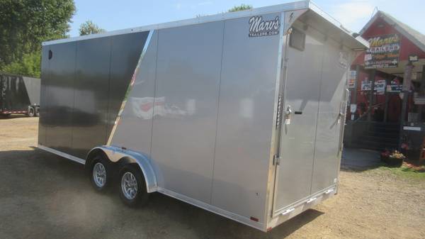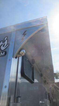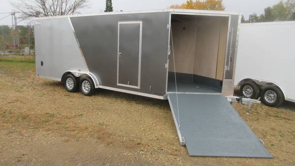 7.5' x 25' (20' + 5' v-nose) Lightning (Forest River) LTFES Aluminum Enclosed Snowmobile/Toy Trailer (2025 Model), Charcoal/Silver 2 tone with chrome stripe, 2-3500# spring axles electric brakes, D-Rated 205/75R15 radial tires, aluminum wheels, E-Z lube hubs, 1 piece aluminum roof, ATP stone guard, ATP nose, flip up jack and wheel, triple tongue, front and rear ramp doors with hinge-less extensions, 3/4" drymax floor/ramp/extension, 5 heavy duty recessed d-rings on floor, 12" high 3/4" kick plate, side door with RV style latch, 2 fuel doors, 16" on center floor/walls/ceiling, 85" interior height, LED clearance lights, pre-wired for Furrion backup camera, LED tail lights with integrated backup lights, rear vortex spoiler with LED loading lights and more.