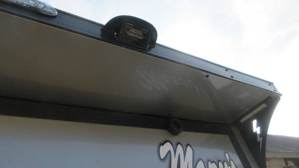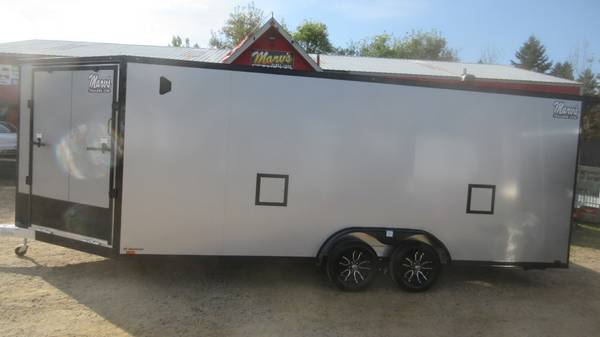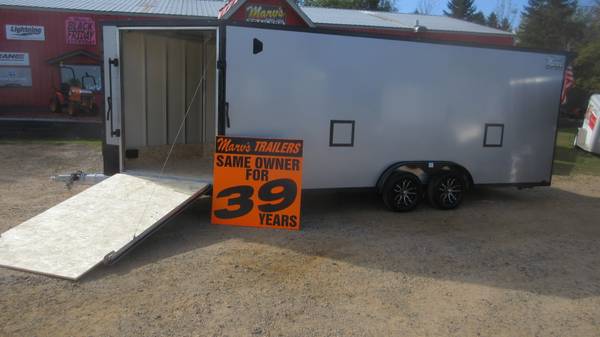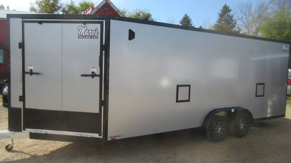 7.5' x 25' (20' + 5' v-nose) Lightning (Forest River) LTFES Aluminum Enclosed Snowmobile/Toy Trailer (2025 Model), Silver with BLACKOUT trim package, 2-3500# spring axles electric brakes, D-Rated 205/75R15 radial tires, black accent aluminum wheels, E-Z lube hubs, 1 piece aluminum roof, 24" ATP stone guard, ATP nose, flip up jack and wheel, triple tongue, front and rear ramp doors with hinge-less extensions (front ramp on drivers side), .080 Poly composite skins, 3/4" drymax floor/ramp/extension, 5 heavy duty recessed d-rings on floor, 12" high 3/4" kick plate, side door with RV style latch, 2 fuel doors, 16" on center floor/walls/ceiling, 85" interior height, rear stabilizer jacks, LED clearance lights, pre-wired for Furrion backup camera, LED tail lights with integrated backup lights, rear vortex spoiler with LED loading lights and more.