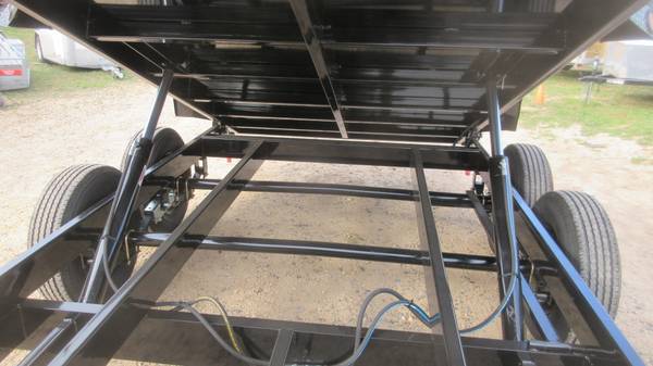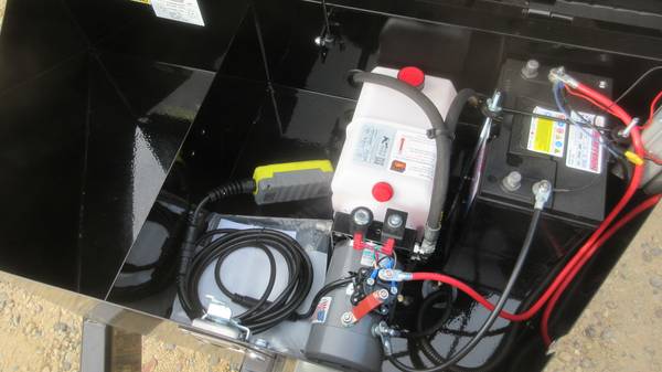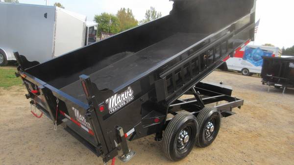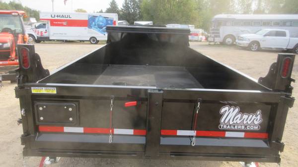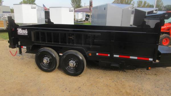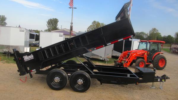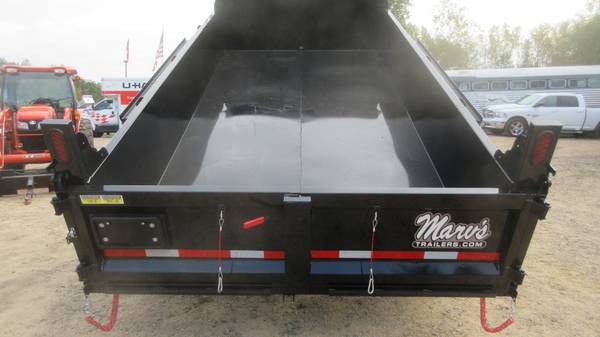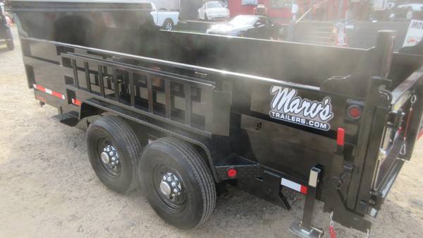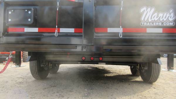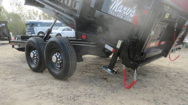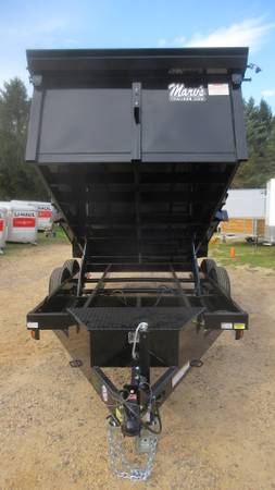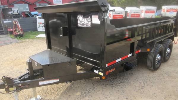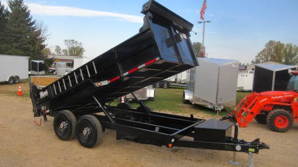 83" x 14' Quality "Dump & Go" Steel Dump Trailer (2026 Model), Black powder coat, 2-7000# axles with electric brakes, E-Rated 235/80R16 radial tires, black mod wheels with chrome center caps, E-Z lube hubs, 3 way gate, skid-steer ramps mounted on the sides, landing gear, dual rams, 24" walls, spare tire mount, gussets to add 2x12 on walls, 36" bulkhead and rear post, 7k square setback drop leg jack, 5 heavy duty d-rings, rub rail, stake pockets, tongue mounted tool box/battery storage, battery charger, adjustable 2-5/16" coupler, safety chains, LED lights, fender steps, 3 year warranty and more!