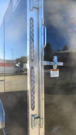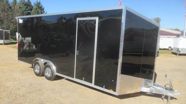 8.5' x 20' + 2' v-nose Lightning LTFCH Aluminum Enclosed Trailer (2026 Model), Black, 2-5200# spring electric brake axles, D-Rated 225/75R15 radial tires, silver mod wheels with chrome beauty rings and center caps, E-Z lube hubs, ramp door with extension, side door with RV style latch and recessed step covered in ATP, LED clearance lights, double LED tail lights with built-in backup lights, 16" LED interior wall lights, 85" interior height with approximately 86.5" ramp door opening, 1 piece aluminum roof, ATP stone guard, side air vents, 16" on center floor/walls/ceiling, 3/4" rainblock floor/ramp/extension, rear vortex spoiler with LED loading lights, 4 heavy duty recessed d-rings, LED dome lights, pre-wired for Furrion backup camera, .080 POLY composite siding and MORE!