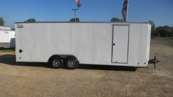 8.5' x 24' + 2' v-nose Wells Cargo FastTrac Enclosed Car/Toy Hauler (2026 Model), White, 2-5200# axles with electric brakes, D-Rated 225/75R15 radial tires, silver mod wheels with chrome beauty rings and center caps, E-Z lube hubs, 1 piece aluminum roof, ATP stone guard, 5000 # ramp door with extension, side door with RV style latch, 4 heavy duty recessed floor d-rings, 2" x 6" tube main rails, 16" OC floor/walls, 3/4" PlexCore floor, 3/8" PlexCore walls, 2 side air vents, 12 volt dome light, LED red lens clearance lights, LED amber lens clearance lights, LED slim line red lens tail lights and more.