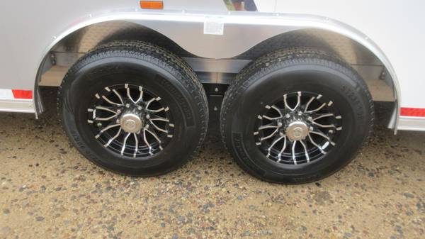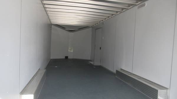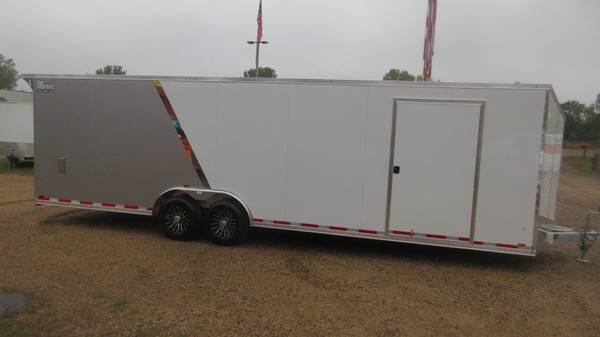 8.5' x 28' + 2' v-nose Lightning LTFCH Aluminum Enclosed Trailer (2026 Model), White/Silver 2-tone with chrome stripe, 2-6000# spring electric brake axles, E-Rated 235/80R16 radial tires, black accent aluminum wheels, E-Z lube hubs, ramp door with hinge-less extension, 48" side door with RV style latch and recessed ATP step, white vinyl walls, LED clearance lights, double LED tail lights with built-in backup lights, midship LED turn signals, conspicuity reflective taping, 72" beavertail, 85" interior height with approximately 86.5" ramp door opening, 1 piece aluminum roof, ATP stone guard, salem side air vents, 16" on center floor/walls/ceiling, 3/4" rainblock floor/ramp/extension, rear vortex spoiler with LED loading lights, 4 heavy duty recessed d-rings, 2 -16" LED dome lights, pre-wired for Furrion backup camera, .080 Poly Composite siding and MORE!