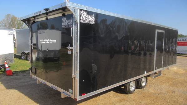 8.5' x 22' + 4' v-nose Lightning LTFES Aluminum Snowmobile Trailer (2025 Model), Black, 2-3000# axles with electric brakes, 17580R13 radial tires, aluminum wheels, E-Z lube hubs, front and rear ramp doors with hinge-less extensions, side door with RV style latch, side step by side door, 1 piece aluminum roof, ATP stone guard, aluminum bar lock upgrade, 5'10" interior height, white vinyl walls, LED clearance lights, double LED tail lights with integrated backup lights, 12" high kickplate on walls, 2 fuel doors, rear spoiler with LED loading lights, pre-wired for Furrion backup camera, 6 heavy duty recessed floor d-rings, 2 side air vents, 3 interior lights and more.