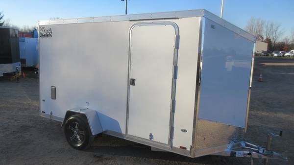 6' x 12' + v-nose AmeraLite ALDR Aluminum Enclosed Trailer (2026 Model), White, 3500# spring axle, D-Rated 205/75R15 radial tires, Liger Lionshead black accent aluminum wheels, E-Z lube hubs, 1 piece aluminum roof, double rear doors with aluminum bar lock, aluminum door holdbacks, 32" side door with RV style latch, .080 Poly composite skins, 3" upper and lower trim, 80" interior height, 16" OC walls/ceiling, pre-wired for Furrion backup camera, ATP stone guard, chrome front nose, chrome front and rear corners, multi-directional Salem side air vents, 1" x 4" chrome based LED marker lights, LED tail lights, 1 interior light and MORE!