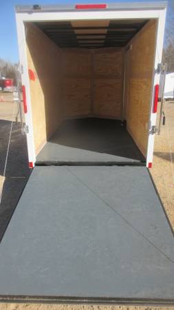 6' x 12' + v-nose Cross Beta Series Enclosed Trailer (2026 Model), White, 3500# spring axle, C-Rated 205/75R15 radial tires, black mod wheels with chrome beauty rings and center caps, E-Z lube hubs, 1 piece aluminum roof, 24" ATP stone guard, ramp door, side door with bar lock, 2" x 3" welded tubular steel main frame, 3/8" plywood walls, 3/4" water resistant floor, 2 side air vents, brushed aluminum fenders, 12 volt LED dome light with integrated switch, LED clearance lights, LED tail lights, 2" coupler, safety chains and more.