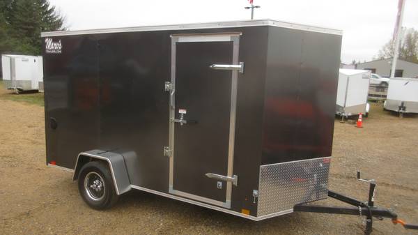 6' x 12' + 2' v-nose Cross "Beta Series" Enclosed Trailer (2025 Model), Charcoal, 3500# axle, C-Rated 205/75R15 radial tires, black mod wheels with chrome beauty rings and center caps, E-Z lube hubs, 1 piece aluminum roof, ramp door with spring assist, side door with bar lock, 2" x 3" welded tubular steel main frame, 2" coupler, 3/8" water resistant walls, 3/4" water resistant floor, side air vents, 24" ATP stone guard, 78" interior height, 12 volt LED dome light with integrated switch, LED exterior lights and more.