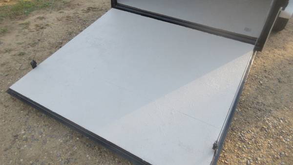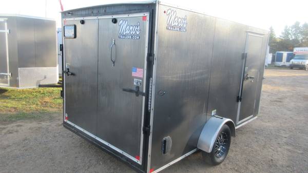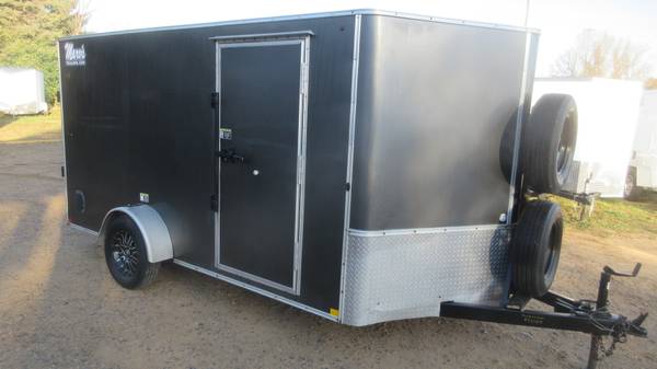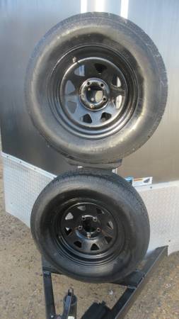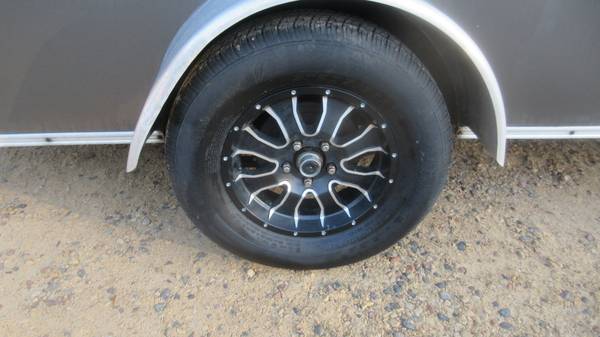 7' x 12' + 3' v-nose H&H Enclosed Trailer (2017 Model), Charcoal, 3500# axle with electric brakes (new brake shoes and greased wheel bearings 10/17/25), 205/75R15 radial tires (weather cracks), black accent aluminum wheels, ramp door, side door with RV style latch and bar lock, 6' interior height, fresh industrial floor paint ($140.00/gallon), painted white walls, roof has some hail dents but it doesn't leak, 2 spare tires with nice custom made front spare tire mount and more.
