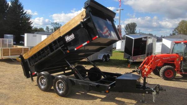 6' x 12' Quality Steel Dump Trailer (Used 2025 Model), Black, 2-5200# axles with electric brakes, D-Rated 225/75R15 radial tires, black wheels with chrome beauty rings and center caps, E-Z lube hubs (bearings greased 9/24/25), tarp kit, adjustable 2-5/16" coupler, safety chains, 24" high walls, battery included, 11 GA floor and walls, barn doors, stake pockets, dual rams, side mounted ramps, treated 2 x 12's added for extra height, LED clearance lights, LED tail lights, front storage (with key) and more.