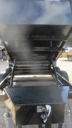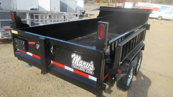 6' x 12' Quality Steel Dump Trailer (2026 Model), primer with Black powder coat, 2-5200# axles with electric brakes, D-Rated 225/75R15 radial tires, GALVANIZED wheels with chrome center caps, E-Z lube hubs, tarp kit, adjustable 2-5/16" coupler, safety chains, 24" high walls, battery included, 11 GA floor and walls, barn doors, stake pockets, dual rams, side mounted ramps, LED clearance lights, LED tail lights, front storage (with key), rear stabilizer jacks and more.