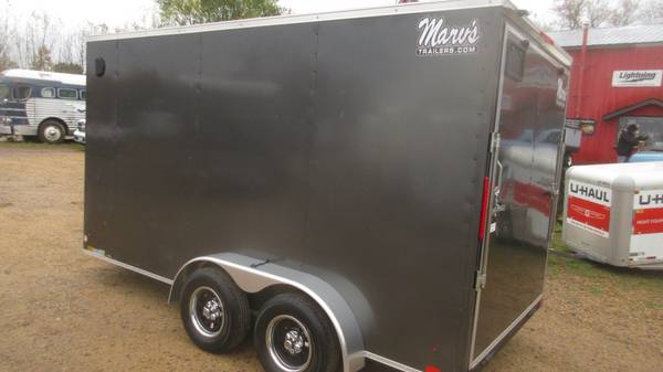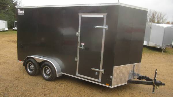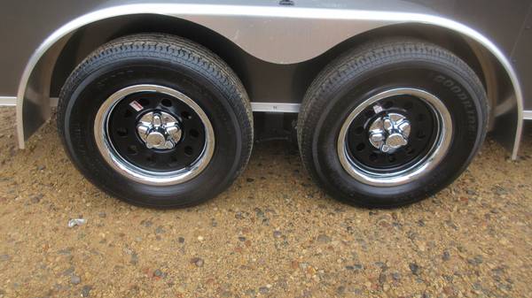 7' x 14' (+ v-nose) Cross 'Beta Series' Enclosed Trailer (2025 Model), Charcoal, 2-3500# Dexter spring axles with electric brakes, 205/75R15 radial tires, black mod wheels with chrome beauty rings and center caps, E-Z lube hubs, 1 piece aluminum roof, 24" ATP stone guard, ramp door, side door with bar lock, 24" OC floor/walls/ceiling, 3/4" water resistant floor, 3/8" water resistant walls, 2" x 4" welded tubular steel main frame, side air vents, 2-5/16" coupler, 7' interior height, LED tail lights, LED clearance lights, 1 interior light and more.