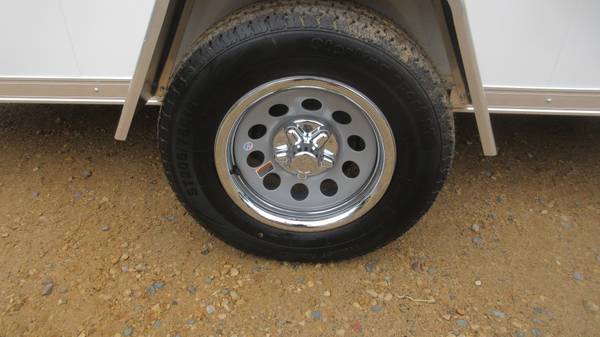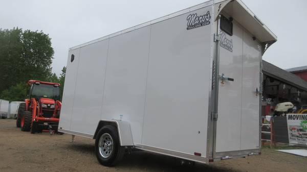 6' x 14' + 2' v-nose Lightning (Forest River) LTF Aluminum Enclosed Trailer (2026 Model), White, 3500# spring idler axle with electric brakes, D-Rated 205/75R15 radial tires, silver mod wheels with chrome beauty rings and center caps, E-Z lube hubs, 1 piece aluminum roof, ATP stone guard, ramp door with extension, side door with RV style latch, 80" interior height with 77" ramp door opening, 3/4" drymax floor/ramp/extension, 4 heavy duty recessed d-rings, 6 surface mounted wall d-rings, 2 side vents, LED clearance lights, LED tail lights, 12 volt interior light, rear spoiler with LED loading lights, rear stabilizer jacks and MORE!