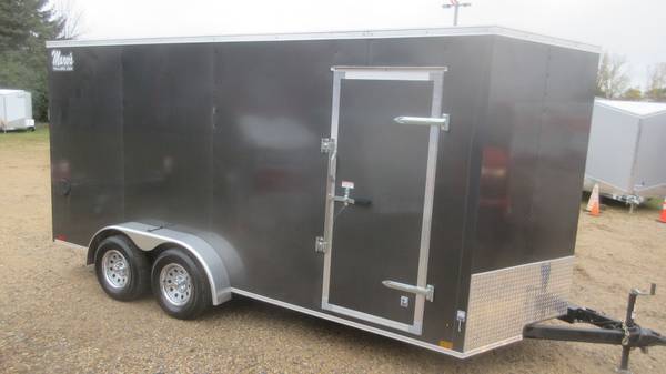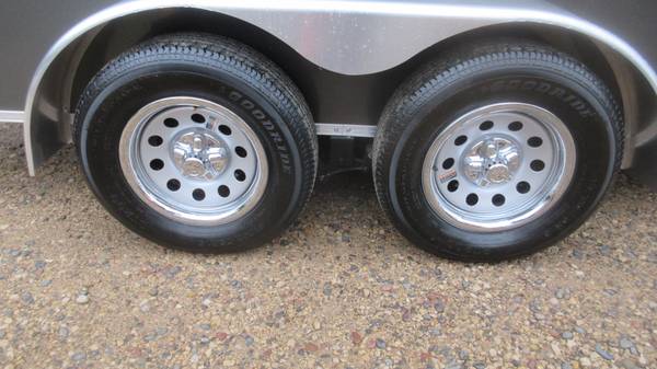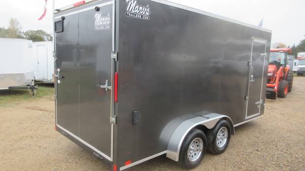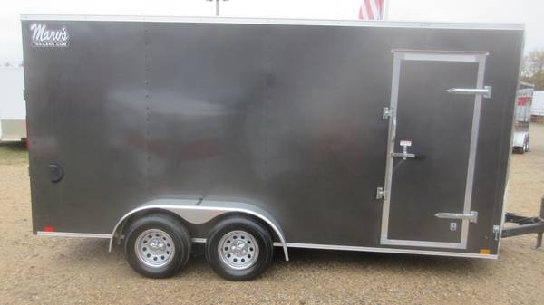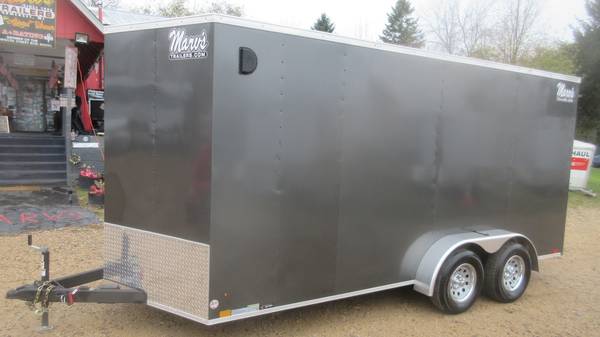 7' x 16' (+ v-nose) Cross 'Beta Series' Enclosed Trailer (2025 Model), Charcoal, 2-3500# Dexter spring axles with electric brakes, 205/75R15 radial tires, silver mod wheels with chrome beauty rings and center caps, E-Z lube hubs, 1 piece aluminum roof, 24" ATP stone guard, ramp door, side door with bar lock, 24" OC floor/walls/ceiling, 3/4" water resistant floor, 3/8" water resistant walls, 2" x 4" welded tubular steel main frame, brushed aluminum fenders, 2-5/16" coupler, 7' interior height, LED tail lights, LED clearance lights, 1 interior light and more.