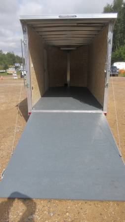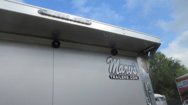 7' x 16' + v-nose Lightning LTF Aluminum Enclosed Trailer (2026 Model), Silver, 2-3500# axles with electric brakes, D-Rated 205/75R15 radial tires, silver mod wheels with chrome beauty rings and center caps, E-Z lube hubs, 1 piece aluminum roof, ATP stone guard, 48" side door with RV style latch (drivers side), ramp door with extension, 3/4" floor, 3/8" walls, 2 side air vents, 4 heavy duty recessed floor d-rings, rear stabilizer jacks, .080 Poly composite skins, 85" interior height with 83" ramp door opening, rear spoiler with LED loading lights, LED clearance lights, LED tail lights and MORE!