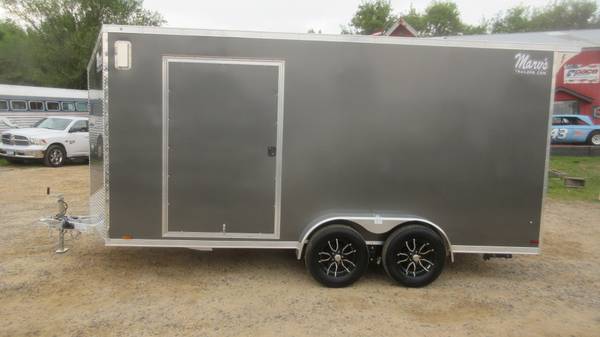 7' x 16' + v-nose Lightning LTF Aluminum Enclosed Trailer (2026 Model), Charcoal, 2-3500# axles with electric brakes, D-Rated 205/75R15 radial tires, black accent aluminum wheels, E-Z lube hubs, 1 piece aluminum roof, ATP stone guard, 48" side door with RV style latch (drivers side), ramp door with extension, 3/4" floor, white vinyl walls, 2 multi-directional Salem side air vents, 4 heavy duty recessed floor d-rings, rear stabilizer jacks, .080 Poly composite skins, 85" interior height with 83" ramp door opening, rear spoiler with LED loading lights, LED clearance lights, LED tail lights and MORE!