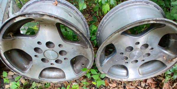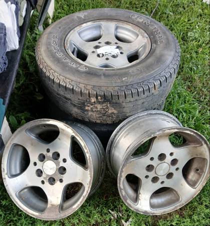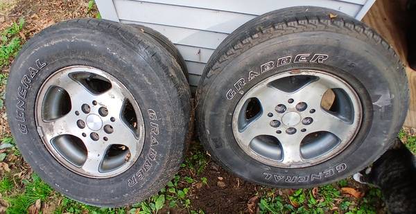 Two tires and two rims. Tires have about 1/8" or slightly less tread, as shown.