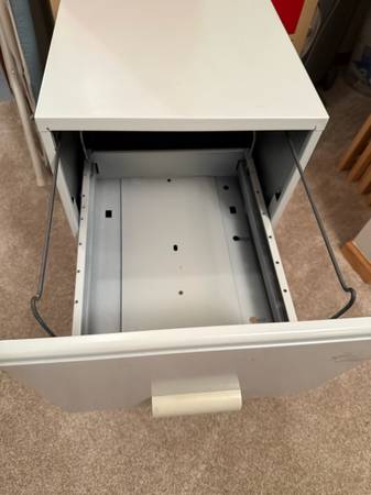 Free filing cabinet. 2 drawers. Note dent in bottom drawer. Do not have key for lock.