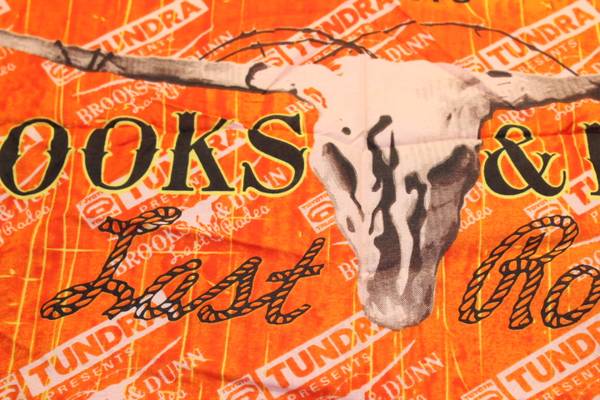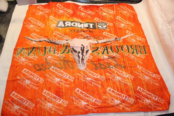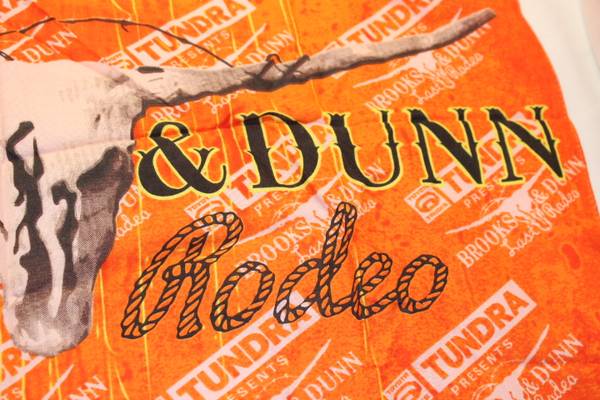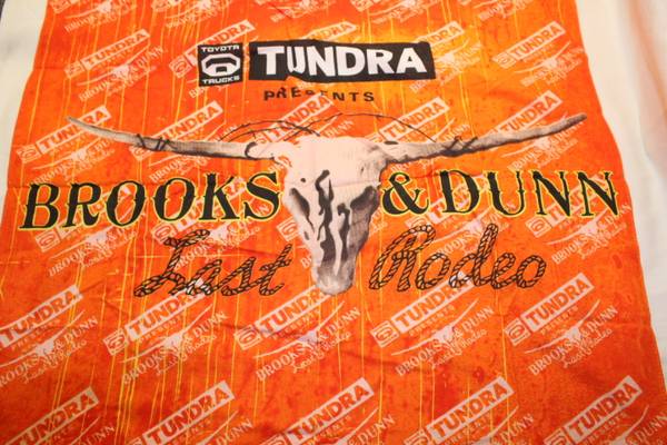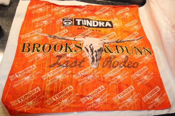 Unique and fun bandanna from the 2010 Brooks & Dunn "The Last Rodeo" concert tour. Printing has the band name, a skull and "Last Rodeo" in rope writing. Measures approximately 20" square. Bandanna is a little wrinkled from being in storage. From a smoke-free home.